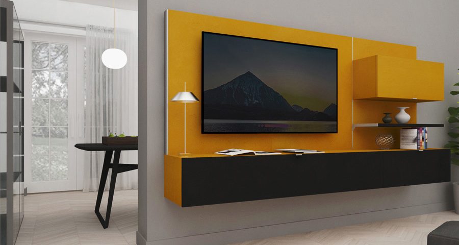 Con semplici elementi è possibile progettare pareti attrezzate arricchite da una serie di mensole, pensili, vani a giorno e base di appoggio per TV, a terra o sospese, capaci di rendere l'ambiente più pratico ed esteticamente elegante.